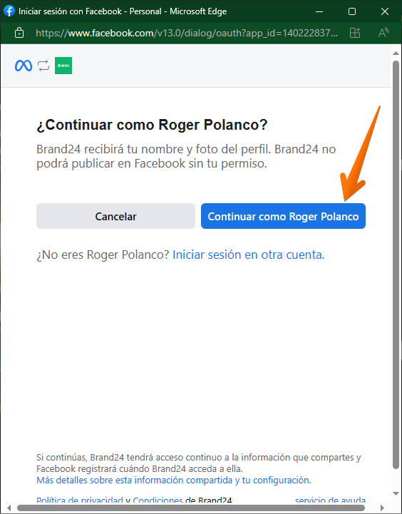 A new floating window will immediately open with your Facebook credentials available. Consequently, what you have to do is to grant Brand24 access permission.